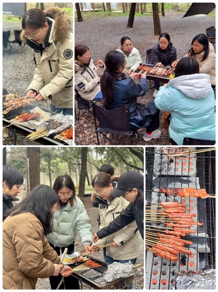 午餐時(shí)分,大家來到綠樹成蔭的燒烤區(qū),開始了自助燒烤活動(dòng)。大家分工合作:有人負(fù)責(zé)烤串,有人負(fù)責(zé)調(diào)味,還有人忙著幫大伙兒準(zhǔn)備餐具和飲料……不多時(shí),香氣四溢的烤串兒陸續(xù)出爐,饞得人直流口水。揀一把自己喜歡的串兒,圍爐閑敘,好不悠閑。都道“人間煙火氣,最撫凡人心”,碳火繚繞輕煙,烘烤著一串串的烤串,也溫暖著爐火邊圍坐的大家,驅(qū)散早春的料峭寒意。