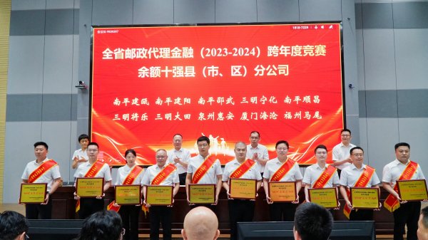 會(huì)上宣讀《關(guān)于郵政代理金融(2023-2024)跨年度競賽獲獎(jiǎng)單位的表彰通報(bào)》。省分公司領(lǐng)導(dǎo)為在主會(huì)場的全省先進(jìn)單位代表頒獎(jiǎng)。會(huì)上,獲得全國跨賽“百優(yōu)地市”的南平市分公司,全省余額保險(xiǎn)“十強(qiáng)縣”的三明寧化縣分公司和獲得全國跨賽“千佳綜合網(wǎng)點(diǎn)”的莆田仙游賴店網(wǎng)點(diǎn)負(fù)責(zé)人分別作了先進(jìn)經(jīng)驗(yàn)分享。會(huì)議要求,受到表彰的單位珍惜榮譽(yù)、再接再厲,再創(chuàng)佳績;全體員工要以先進(jìn)典型為榜樣,砥礪奮進(jìn)、比學(xué)趕超,共同推進(jìn)全省郵政代理金融業(yè)務(wù)高質(zhì)量發(fā)展。