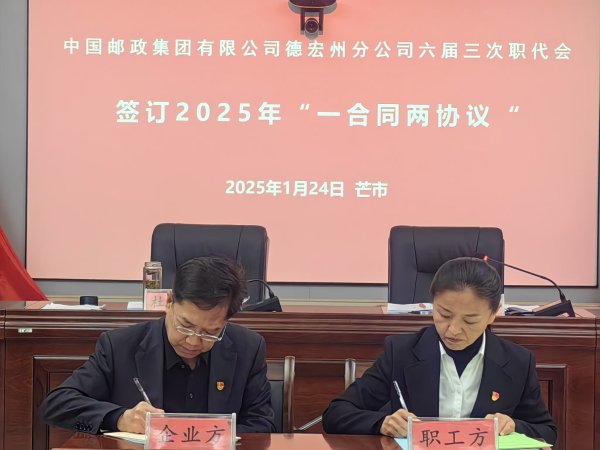 大會總結(jié)2024年工作,部署2025年任務(wù),會議聽取了州分公司黨委書記、總經(jīng)理杜國祥所作的題為“攻堅克難勇?lián)?dāng)增強能力提質(zhì)效持續(xù)推動德宏郵政高質(zhì)量發(fā)展”的行政工作報告和州郵政工會主席段春燕作的題為“夯基礎(chǔ) 強服務(wù)勇?lián)?dāng) 凝心聚力為德宏郵政高質(zhì)量發(fā)展貢獻力量”的工會工作報告。大會通過了職代會四個專門委員會的工作報告和2024年“一合同兩協(xié)議”履行情況報告,以及工代會的工會財務(wù)、女工委、經(jīng)審工作報告,職工代表對州分公司領(lǐng)導(dǎo)班子及成員進行了民主評議,企業(yè)與工會簽訂了2025年《中國郵政集團有限公司德宏州分公司集體合同》《中國郵政集團有限公司德宏州分公司工資集體協(xié)商專項協(xié)議》《中國郵政集團有限公司德宏州分公司女職工特殊保護專項協(xié)議》。