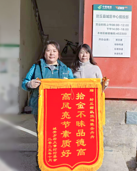 近日,河南省新鄉(xiāng)市封丘縣城關(guān)鄉(xiāng)后大章村的村民彭大娘和村委委員一起,來到了封丘縣郵政分公司城區(qū)中心攬投部,要當(dāng)面感謝攬投員岳丹丹。不巧的是岳丹丹正在段道上投遞,二人就將一面寫有“拾金不昧品德高,高風(fēng)亮節(jié)素質(zhì)好”的錦旗交給了攬投部?jī)?nèi)務(wù)人員。彭大娘還再三叮囑說,一定要把錦旗交給岳丹丹。